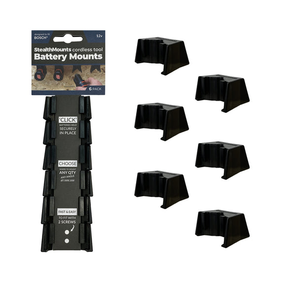 StealthMounts Battery Mounts for Bosch 10.8v/12v cordless batteries keep your batteries organised and exactly where you need them. Batteries fit by clicking into the holder and are only released by pressing the release button on the battery. Batteries can be held at any angle locked in the holder and will not fall out even whilst travelling. Perfect for mobile setups or workshops! Manufactured in the United Kingdom our Bosch 10.8v/12v Battery Mounts are made using extremely durable injection moulded ABS plastic with countersunk screw holes to allow for firm mounting on multiple surfaces. Great for keeping track of your batteries and staying organised. They can be mounted at any distance from one another and in tight spaces for maximum workshop efficiency. Mount them in your workshop, under shelves, toolboxes, tool trailers or in your work vehicles with due care. They can also be looped through a belt for use on the job site.