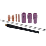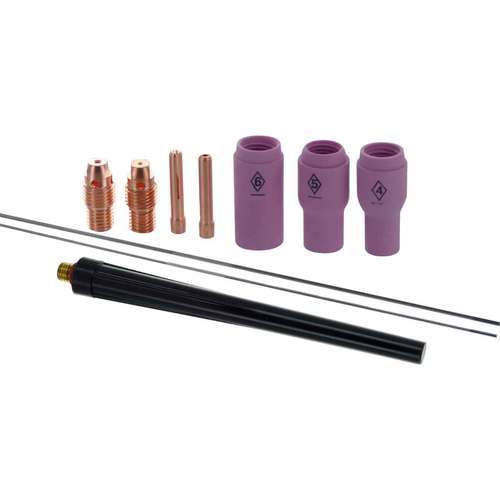This accessory kit features all the necessary front-end and back-end consumables to TIG weld with your 2 series TIG torch.