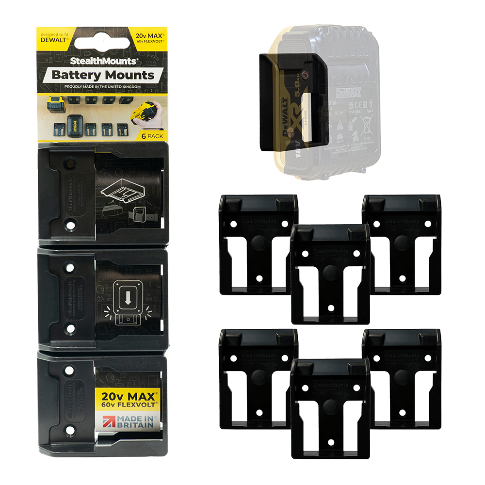 StealthMounts Battery Mounts for Dewalt 20v cordless batteries keep your batteries organised and exactly where you need them. Batteries fit by clicking into the holder and are only released by pressing the release button on the battery. Batteries can be held at any angle locked in the holder and will not fall out even whilst travelling. Perfect for mobile setups or workshops! Manufactured in the United Kingdom our Dewalt 20v Battery Mounts are made using extremely durable injection moulded ABS plastic with countersunk screw holes to allow for firm mounting on multiple surfaces. Great for keeping track of your batteries and staying organised. They can be mounted at any distance from one another and in tight spaces for maximum workshop efficiency. Mount them in your workshop, under shelves, toolboxes, tool trailers or in your work vehicles with due care. They can also be looped through a belt for use on the job site. StealthMounts Battery Mounts are available colour coded to match your Dewalt platform.