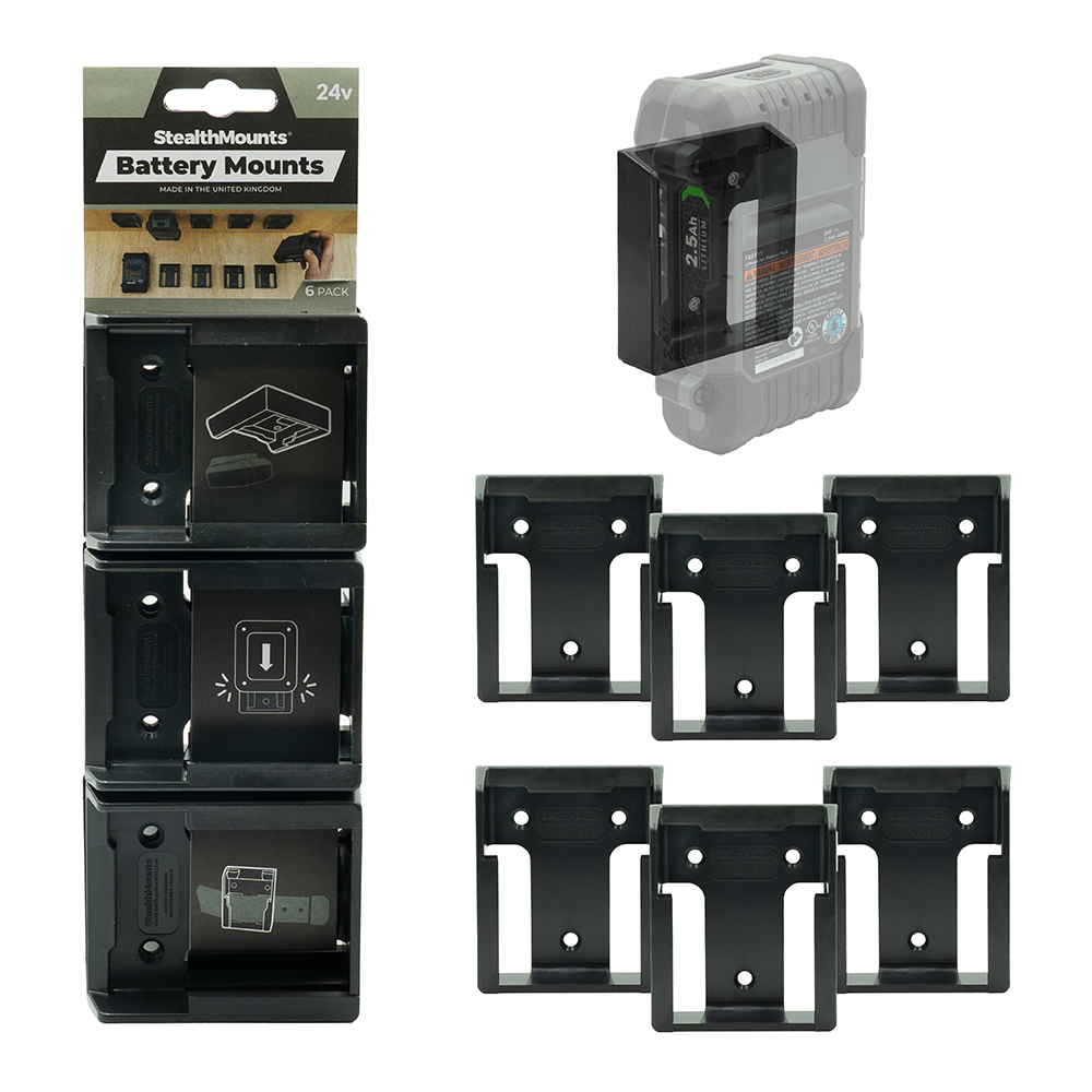 StealthMounts Battery Mounts for Flex 24v cordless batteries keep your batteries organised and exactly where you need them. Batteries fit by clicking into the holder and are only released by pressing the release button on the battery. Batteries can be held at any angle locked in the holder and will not fall out even whilst travelling. Perfect for mobile setups or workshops! Manufactured in the United Kingdom our Flex 24v Battery Mounts are made using extremely durable injection moulded ABS plastic with countersunk screw holes to allow for firm mounting on multiple surfaces. Great for keeping track of your batteries and staying organised. They can be mounted at any distance from one another and in tight spaces for maximum workshop efficiency. Mount them in your workshop, under shelves, toolboxes, tool trailers or in your work vehicles with due care. They can also be looped through a belt for use on the job site. StealthMounts Battery Mounts are available colour coded to match your Flex platform.
