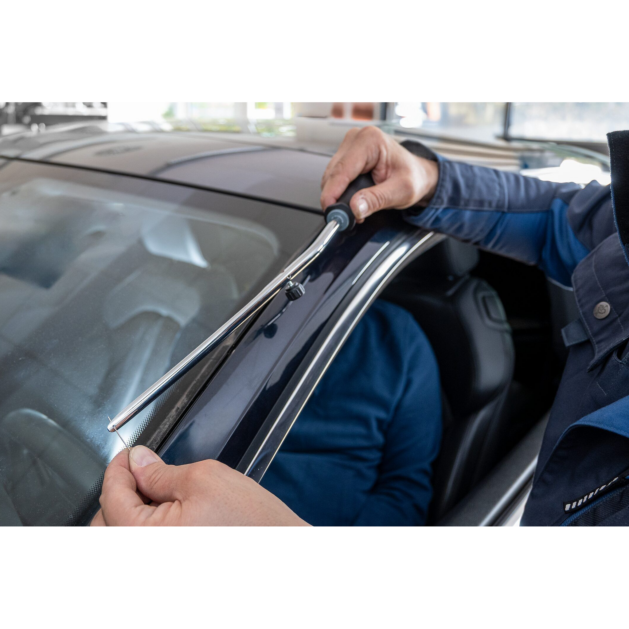 Extraction of glued car windows - Self-closing safety pull handles hold the sawing or cutting wire firmly