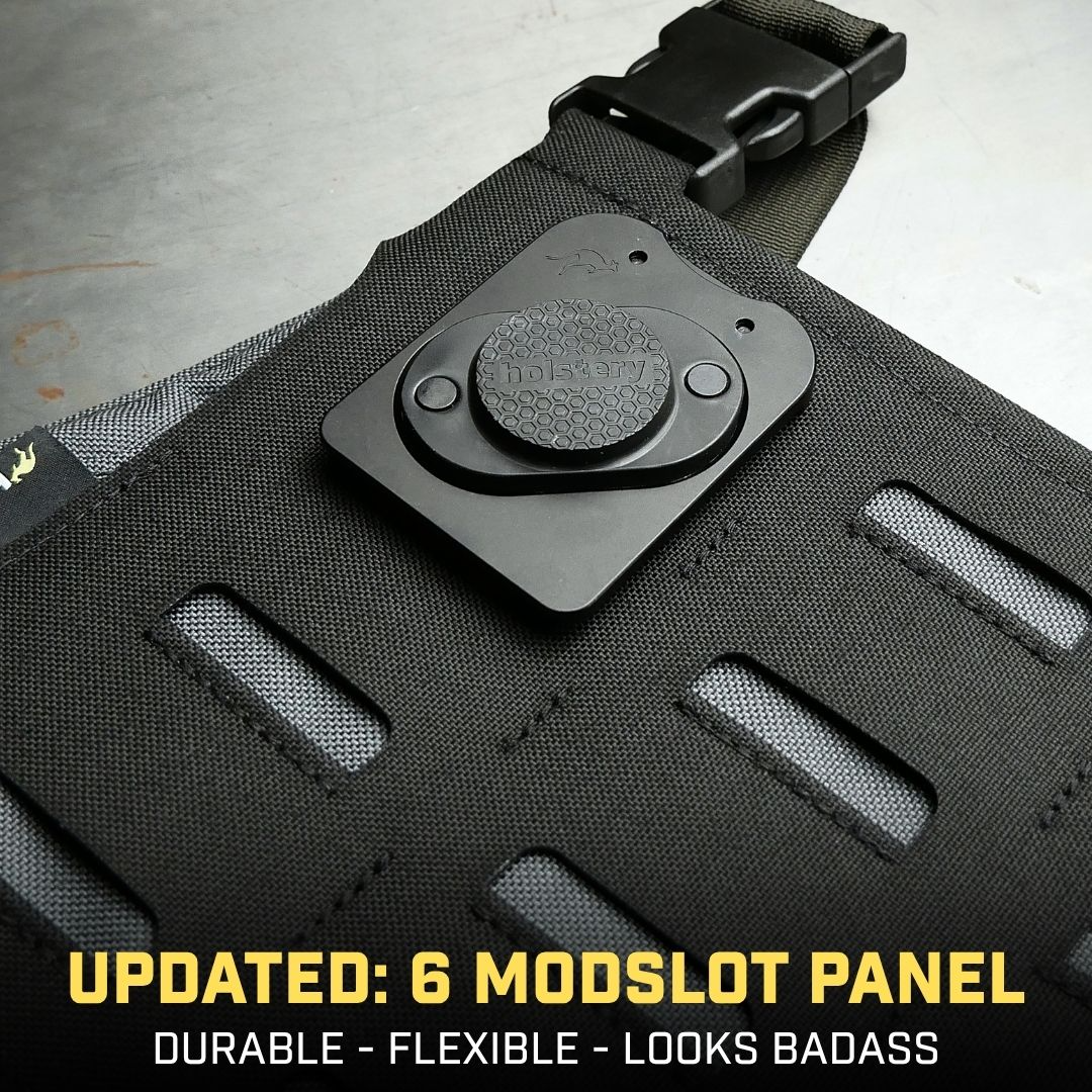 - NEW! - Updated front panel with 6 ModSlots. Compatible with all of our tool holsters and pouches that have plastic or steel 1.75" clips.