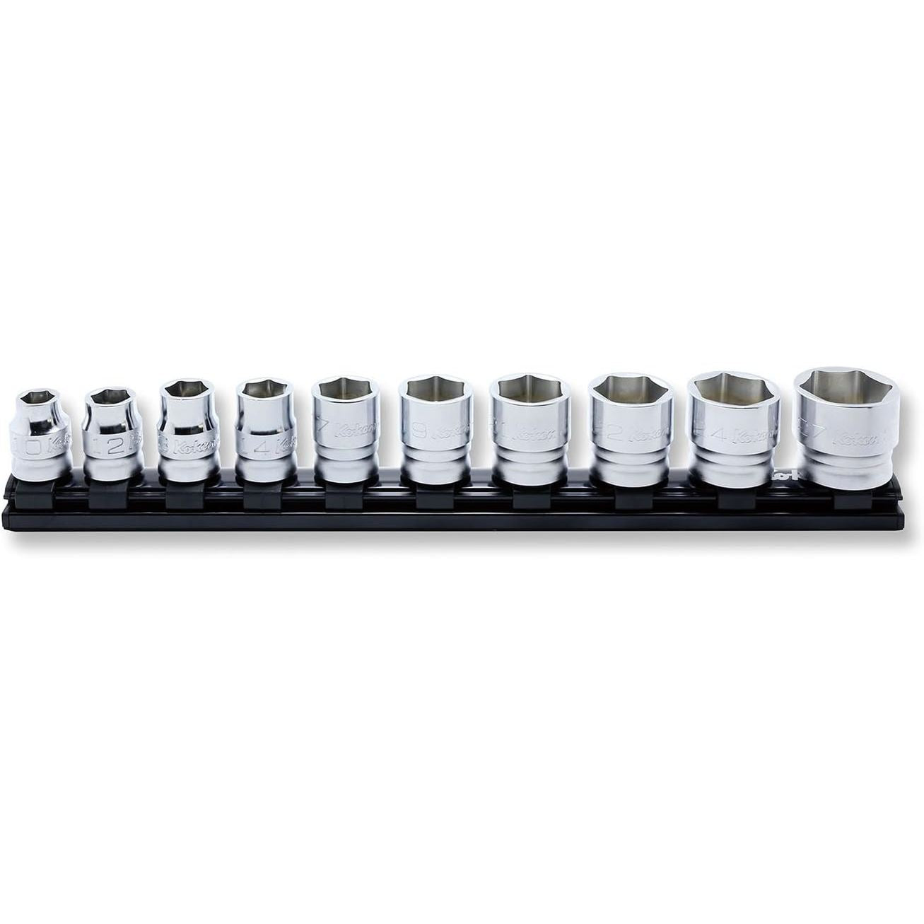 The Ko-ken RS4400MZ/10 1/2" Square Drive Socket Set is a comprehensive Z-series collection that includes ten high-performance 6-point sockets, sized 10mm, 12mm, 13mm, 14mm, 17mm, 19mm, 21mm, 22mm, 24mm, and 27mm, all securely mounted on a sturdy 300mm rail for easy organization and access. This socket set is engineered to provide superior torque transmission and durability, making it ideal for a wide range of applications. With its exceptional design, the Ko-ken RS4400MZ/10 Socket Set ensures a perfect fit and a reliable grip, making it an essential addition to any tool collection for professionals and enthusiasts alike.