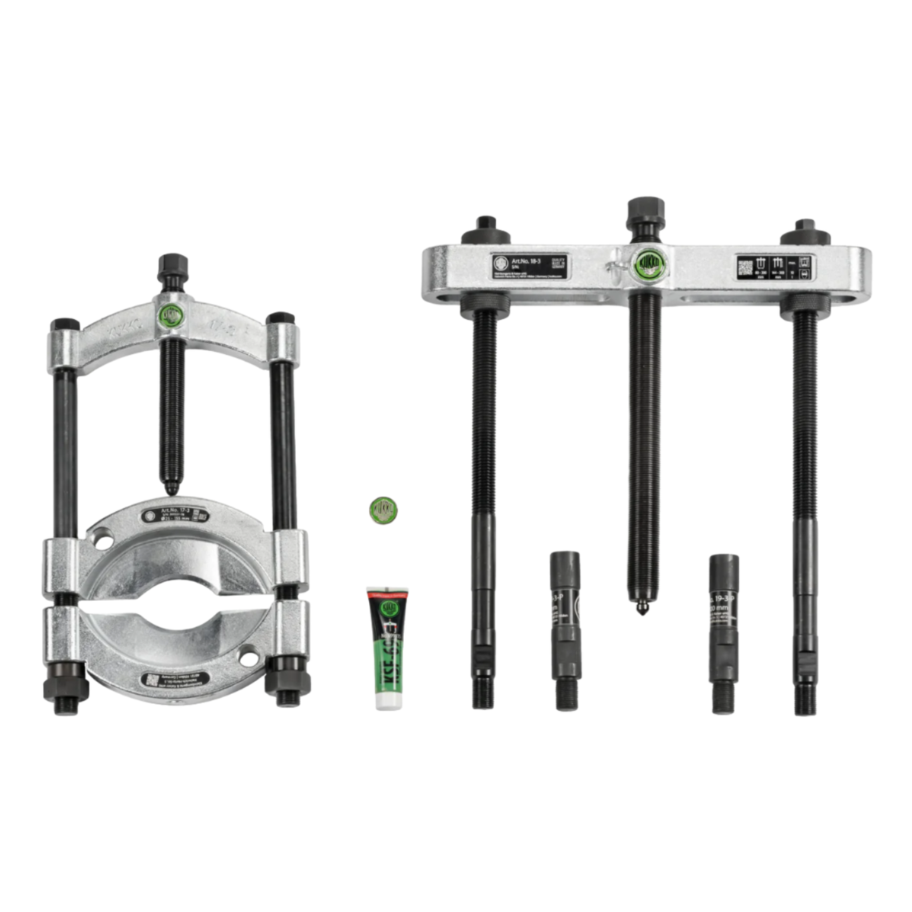 The 4-piece separator set 17-C is used for pulling ball bearings, roller bearings, inner rings, and other flat-lying parts in crafts, industry, and workshops when there is insufficient space for puller jaws. The separating and pulling process is capable of gently separating those parts before they can be pulled off from the outside. Compared to the series 15, the series 17 is particularly handy because the separating jaws can be quickly and concentrically tightened by a pressure spindle. This 4-piece set includes a separating and pulling device, as well as a pair of extensions, ensuring the full range of applications.