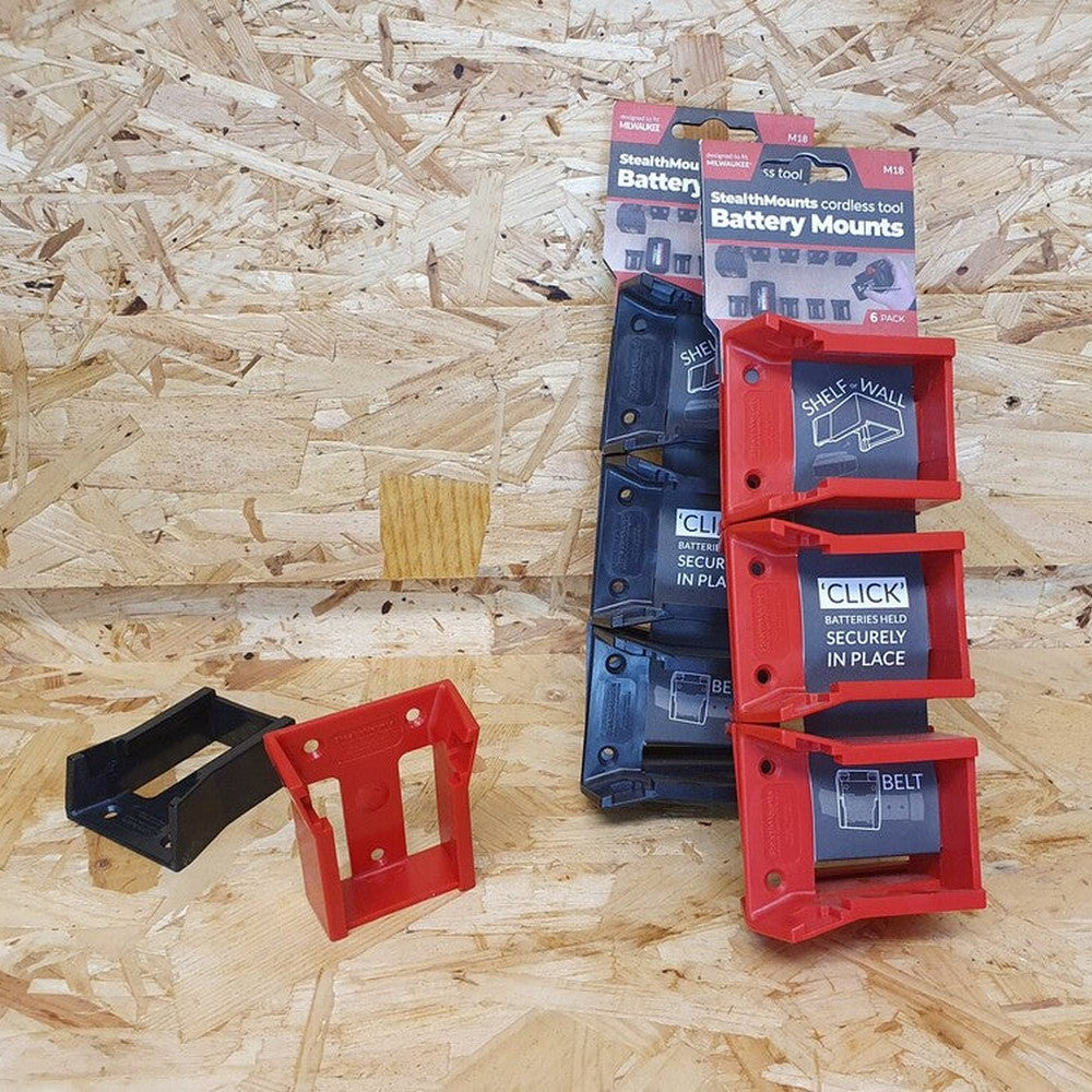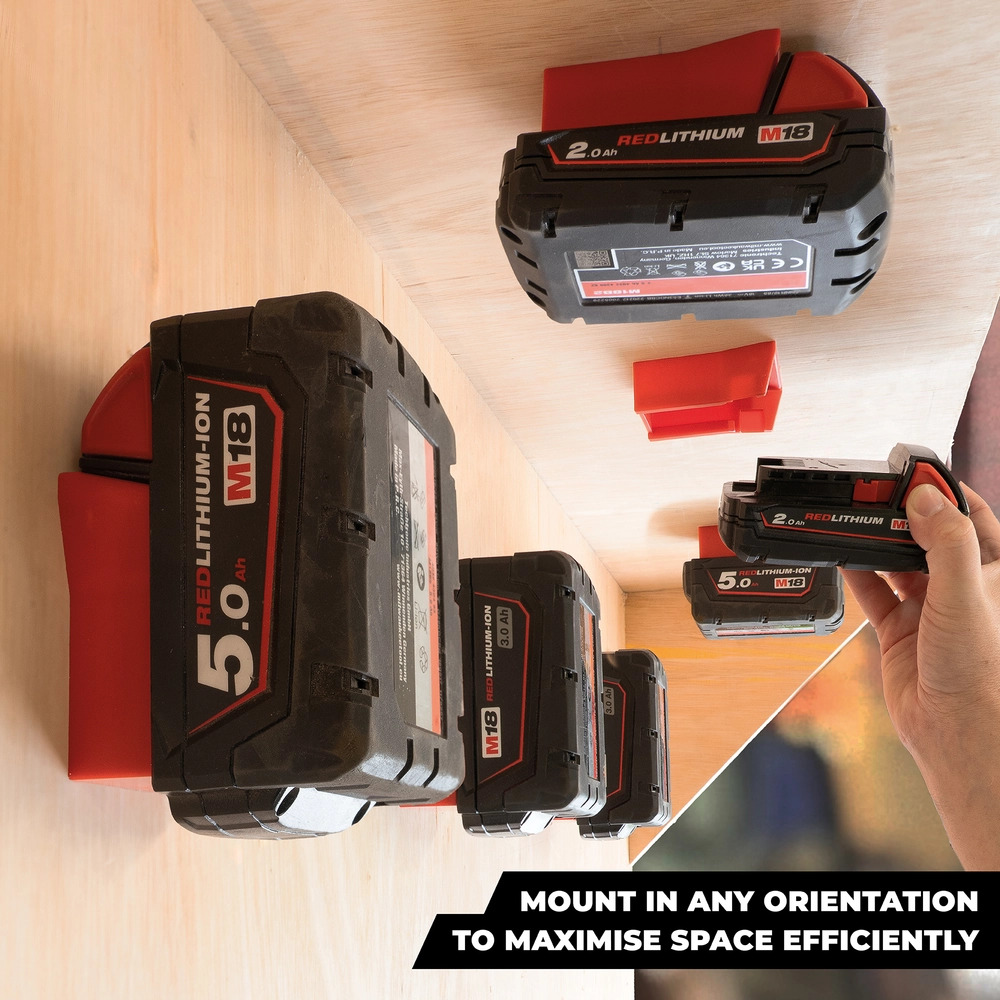 StealthMounts Battery Mounts for Milwaukee M18 cordless batteries keep your batteries organised and exactly where you need them. Batteries fit by clicking into the holder and are only released by pressing the release button on the battery. Batteries can be held at any angle locked in the holder and will not fall out even whilst travelling. Perfect for mobile setups or workshops! Manufactured in the United Kingdom our Milwaukee M18 Battery Mounts are made using extremely durable injection moulded ABS plastic with countersunk screw holes to allow for firm mounting on multiple surfaces. Great for keeping track of your batteries and staying organised. They can be mounted at any distance from one another and in tight spaces for maximum workshop efficiency. Mount them in your workshop, under shelves, toolboxes, tool trailers or in your work vehicles with due care. They can also be looped through a belt for use on the job site. StealthMounts Battery Mounts are available colour coded to match your Milwaukee platform.