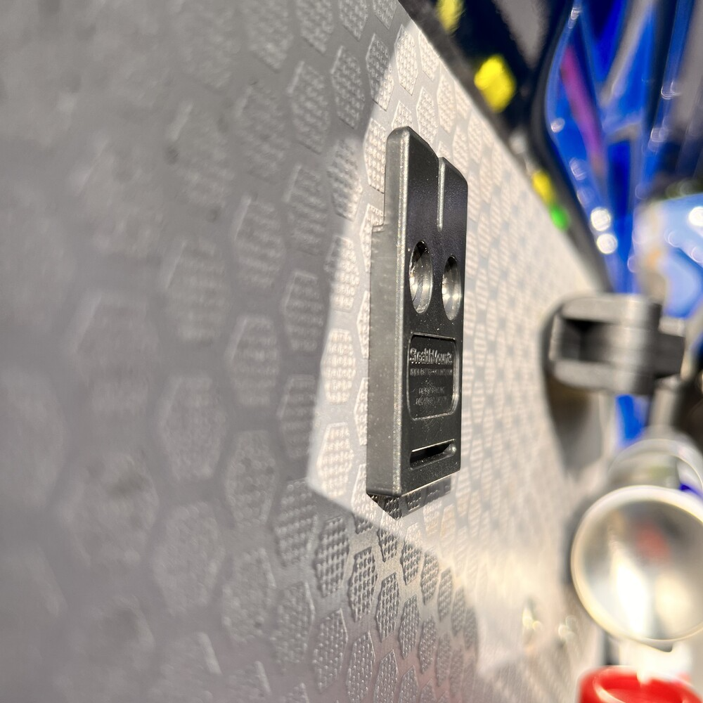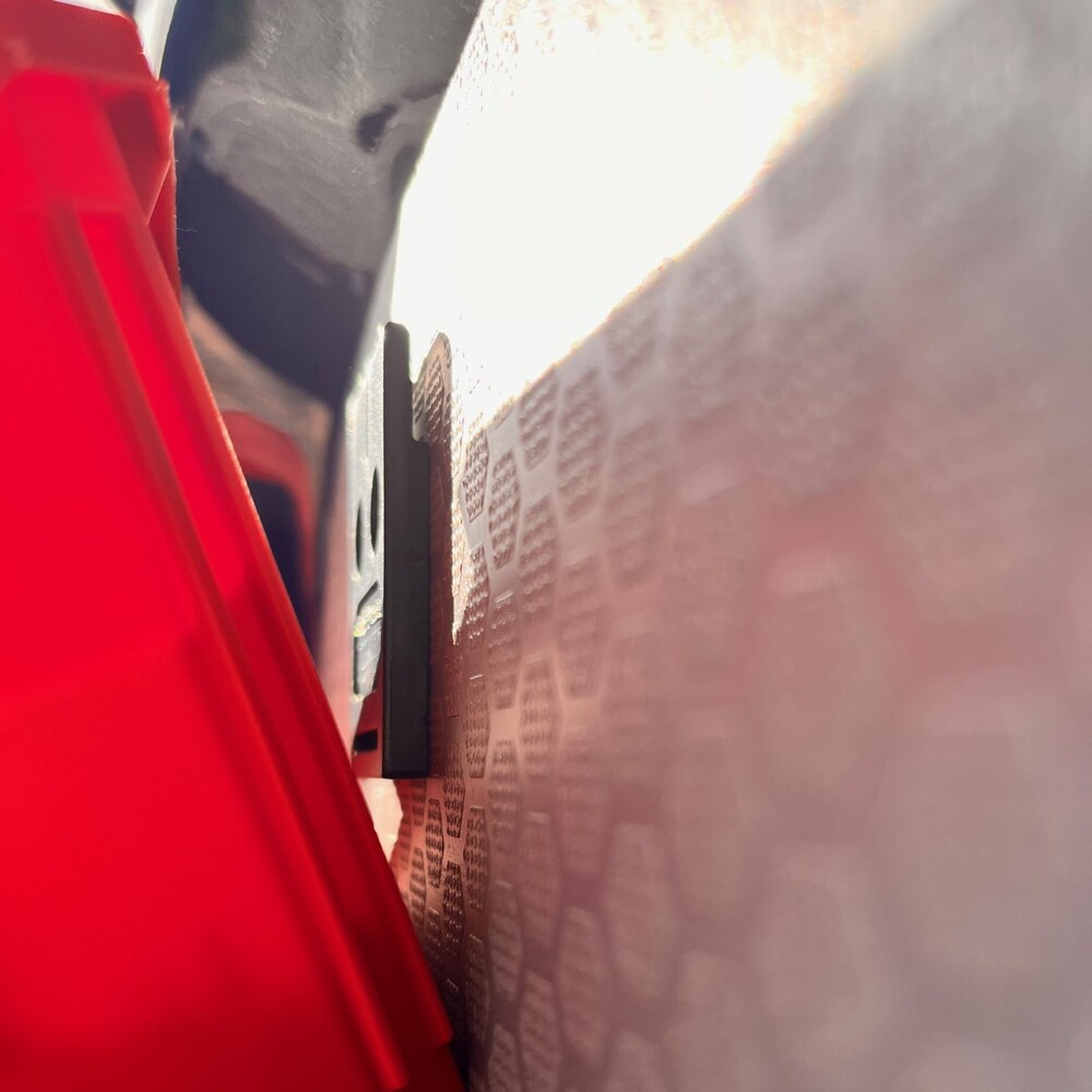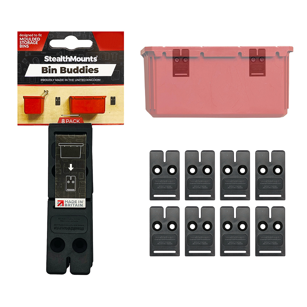 StealthMounts Black Bin Buddy is designed for Packout Bins, Ridgid AEG Bins, and Keter Bins, enabling secure mounting to any flat surface. Simply attach the Bin Mount to a wall in your workshop or tool trailer for easy organisation of extra bins. Ideal for mobile setups or workshops, the Bin Buddy ensures flush mounting to walls, keeping bins level and contents secure. They can be mounted at any distance in tight spaces for maximum efficiency and used under shelves, in trailers, or work vehicles with care. Made in the United Kingdom from durable injection moulded ABS plastic with countersunk screw holes for secure mounting.