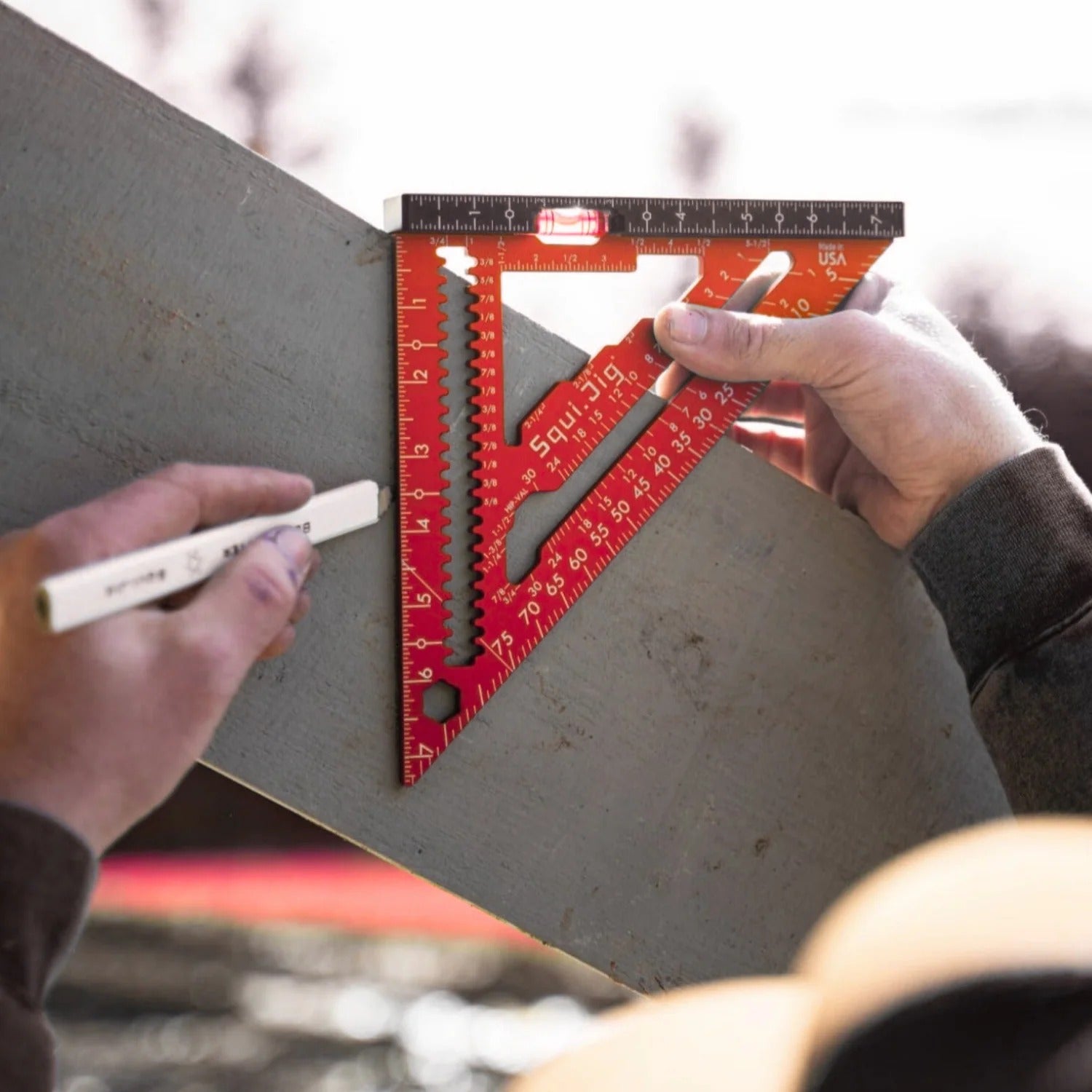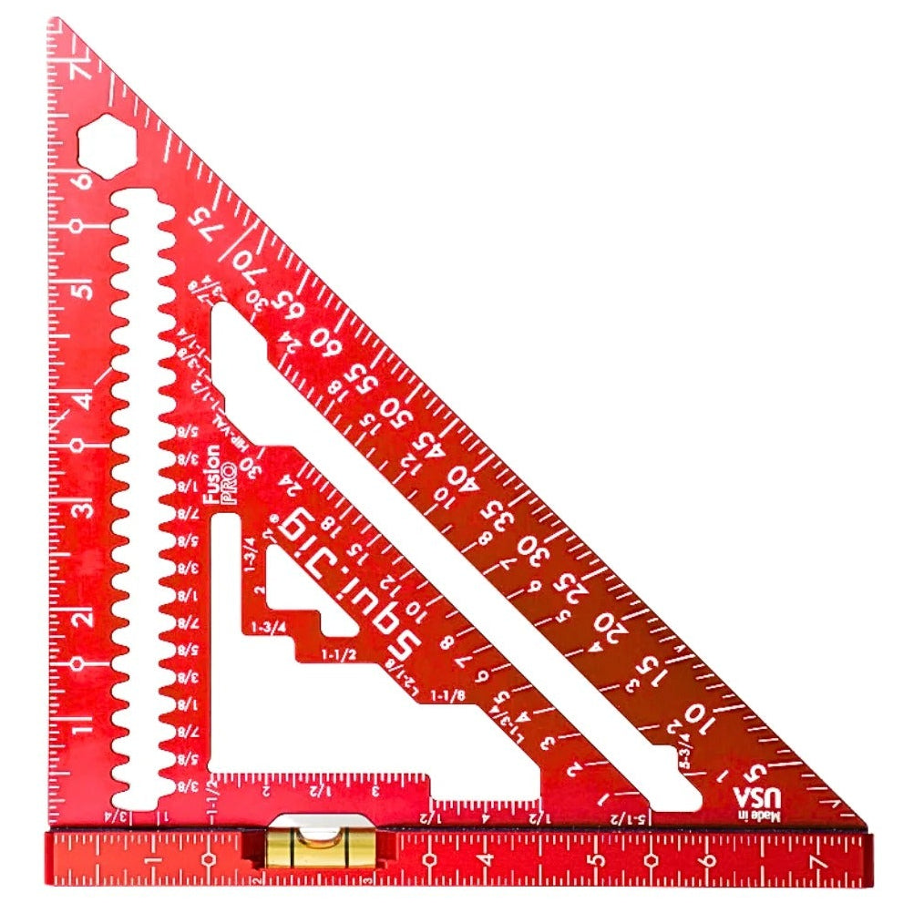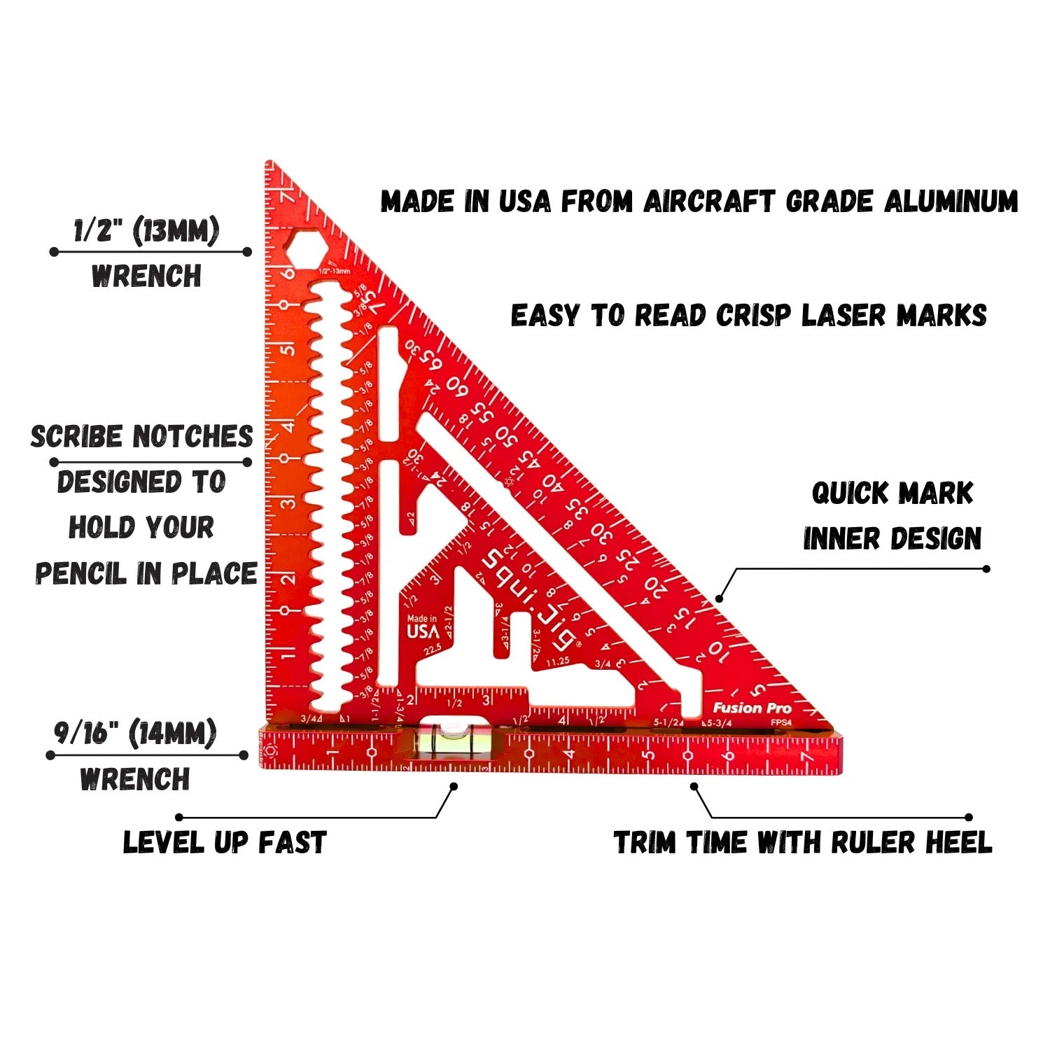 The SquiJig Fusion pro features an Ultra-Visible 360 vial for precise levelling, while the ruler heel helps trim time for efficient work. The quick mark inner design allows for fast measurements, and the crisp laser marks are easy to read for accuracy. Built-in blade wrenches in 1/2" (13mm) and 9/16" (14mm) sizes add convenience, while scribe notches are specifically designed to hold your pencil in place. Weighing only 10.3 oz, this tool is lightweight yet durable, with CNC machining that ensures superior craftsmanship. Additionally, the patented Wrench on the Heel is a unique feature exclusive to our design, further enhancing its functionality. Proudly 100% made in the USA.