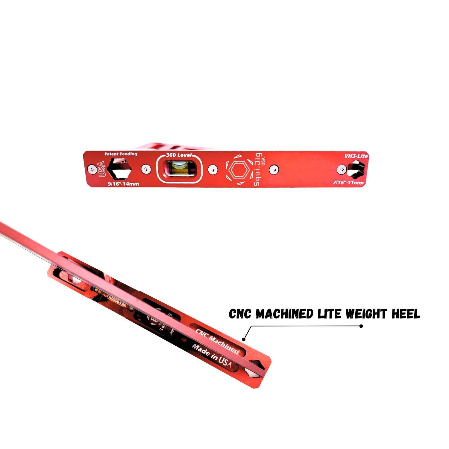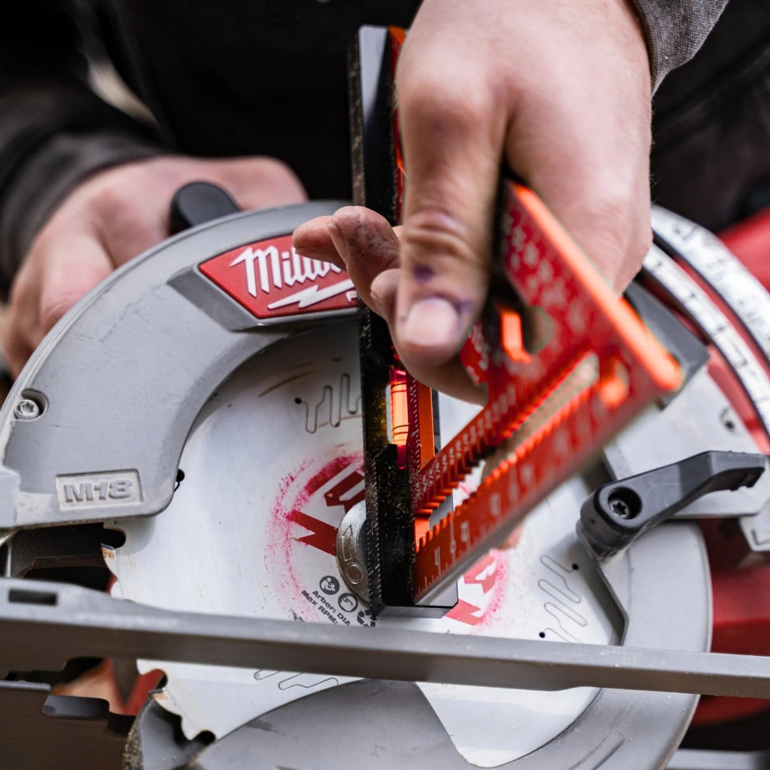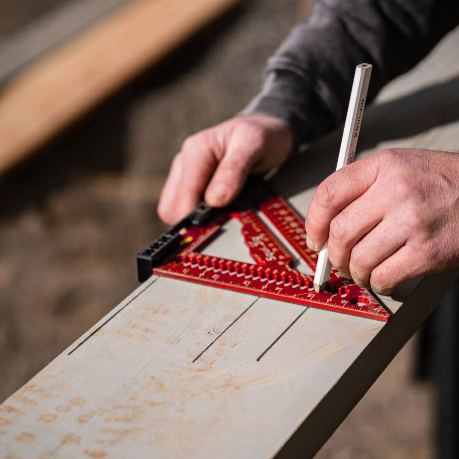 The SquiJig Fusion pro features an Ultra-Visible 360 vial for precise levelling, while the ruler heel helps trim time for efficient work. The quick mark inner design allows for fast measurements, and the crisp laser marks are easy to read for accuracy. Built-in blade wrenches in 1/2" (13mm) and 9/16" (14mm) sizes add convenience, while scribe notches are specifically designed to hold your pencil in place. Weighing only 10.3 oz, this tool is lightweight yet durable, with CNC machining that ensures superior craftsmanship. Additionally, the patented Wrench on the Heel is a unique feature exclusive to our design, further enhancing its functionality. Proudly 100% made in the USA.