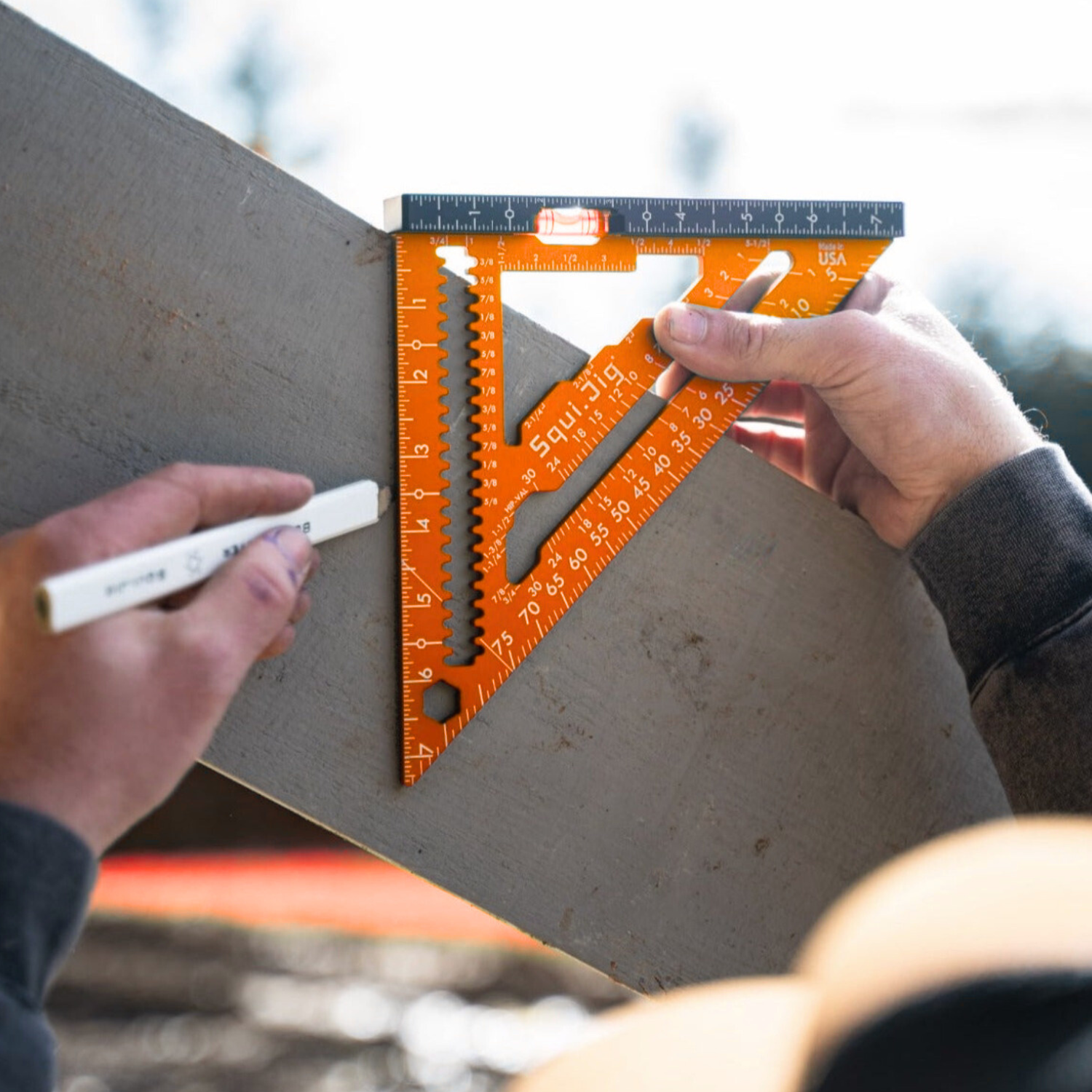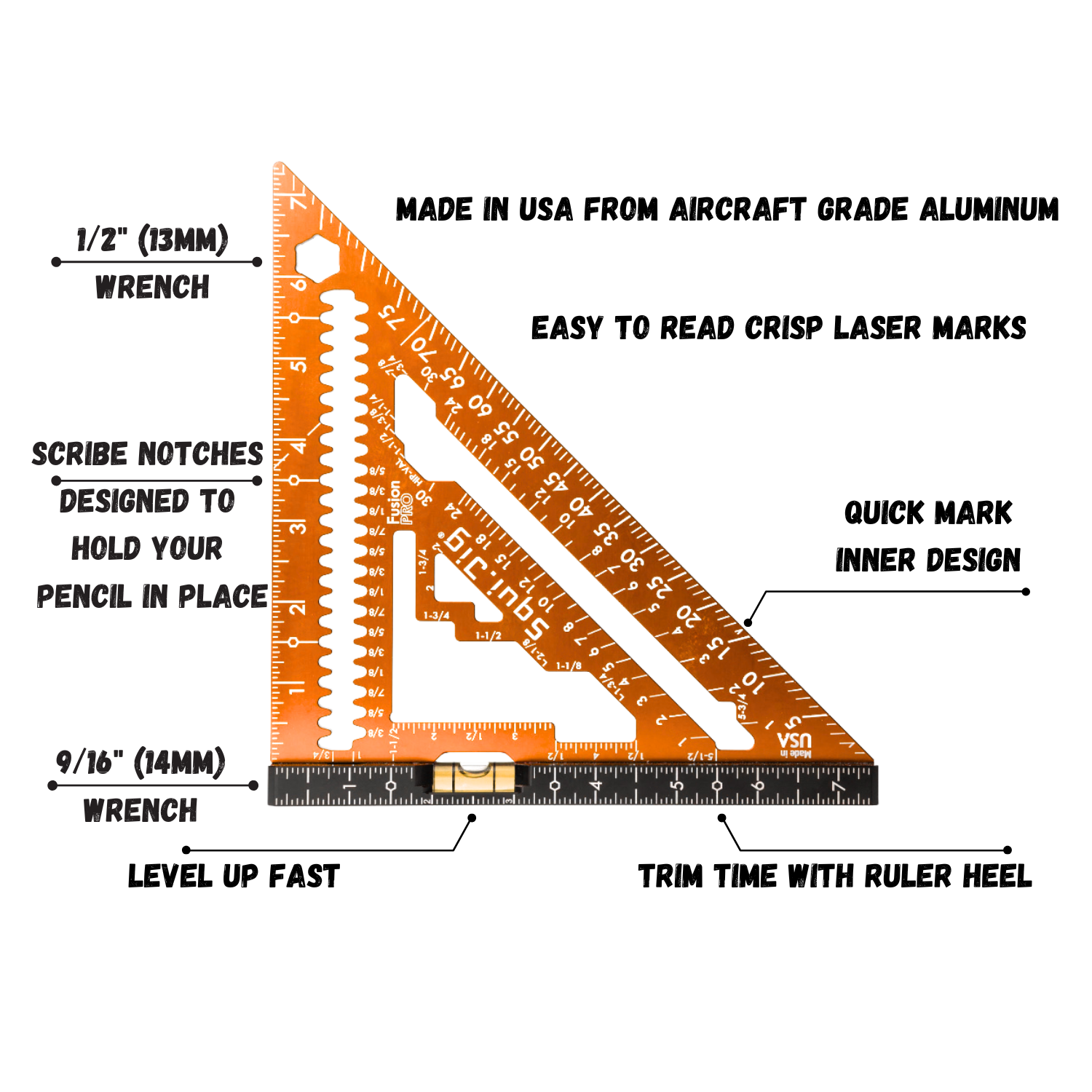 The SquiJig Fusion pro features an Ultra-Visible 360 vial for precise levelling, while the ruler heel helps trim time for efficient work. The quick mark inner design allows for fast measurements, and the crisp laser marks are easy to read for accuracy. Built-in blade wrenches in 1/2" (13mm) and 9/16" (14mm) sizes add convenience, while scribe notches are specifically designed to hold your pencil in place. Weighing only 10.3 oz, this tool is lightweight yet durable, with CNC machining that ensures superior craftsmanship. Additionally, the patented Wrench on the Heel is a unique feature exclusive to our design, further enhancing its functionality. Proudly 100% made in the USA.
