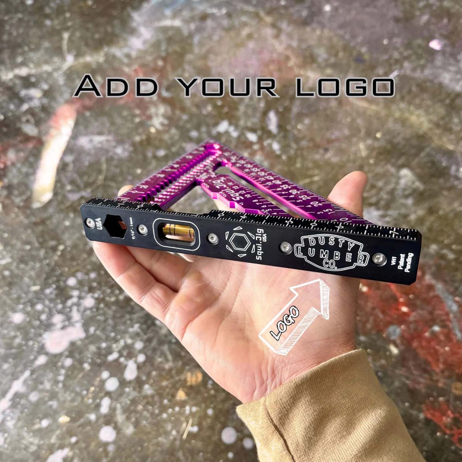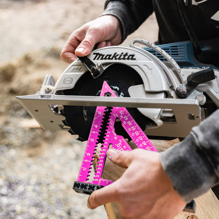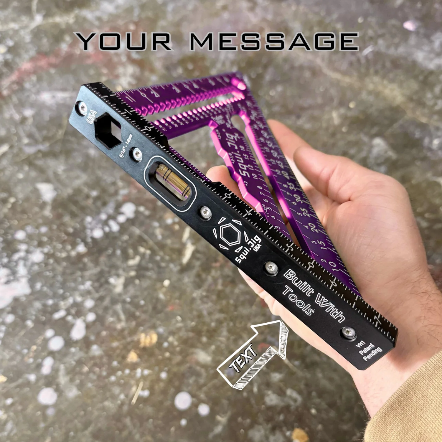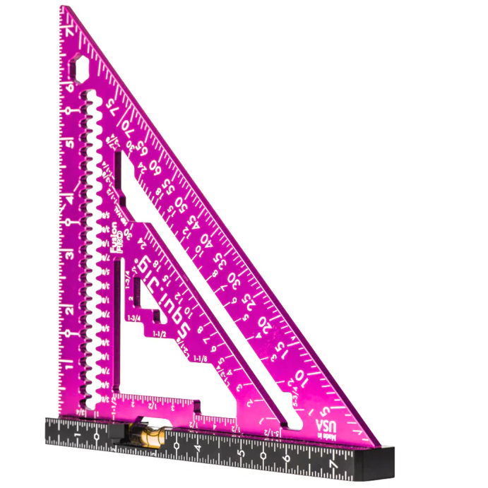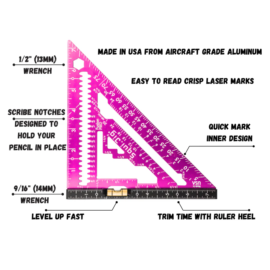 The SquiJig Fusion pro features an Ultra-Visible 360 vial for precise levelling, while the ruler heel helps trim time for efficient work. The quick mark inner design allows for fast measurements, and the crisp laser marks are easy to read for accuracy. Built-in blade wrenches in 1/2" (13mm) and 9/16" (14mm) sizes add convenience, while scribe notches are specifically designed to hold your pencil in place. Weighing only 10.3 oz, this tool is lightweight yet durable, with CNC machining that ensures superior craftsmanship. Additionally, the patented Wrench on the Heel is a unique feature exclusive to our design, further enhancing its functionality. Proudly 100% made in the USA.