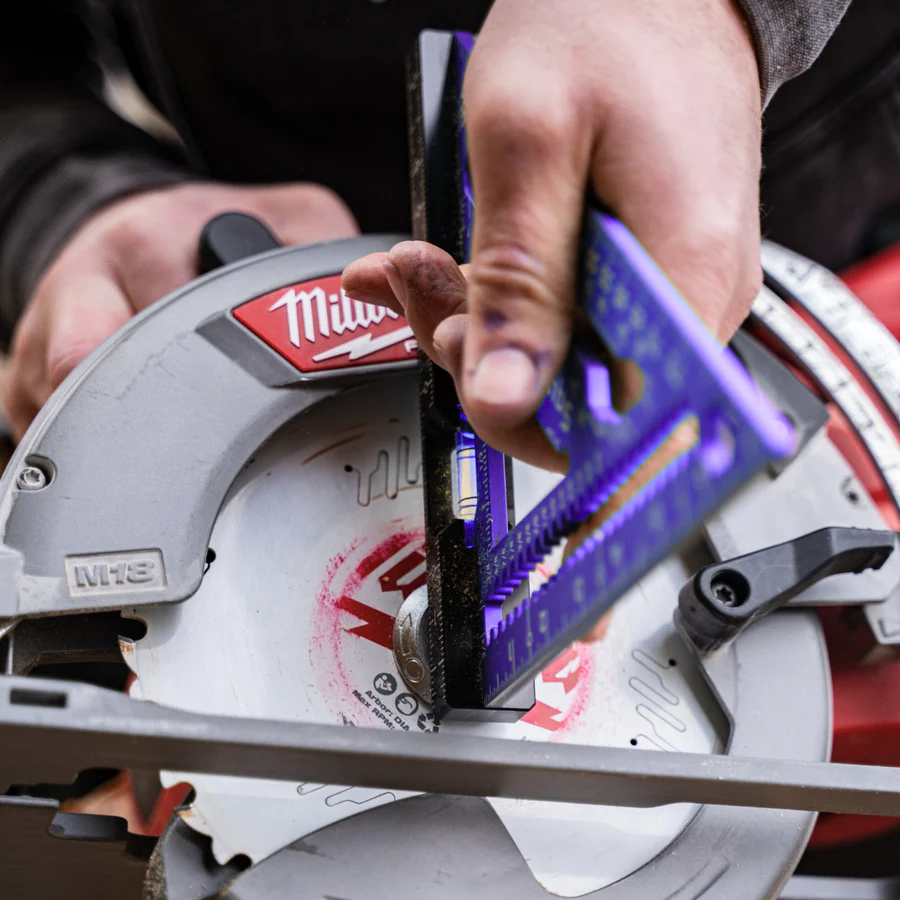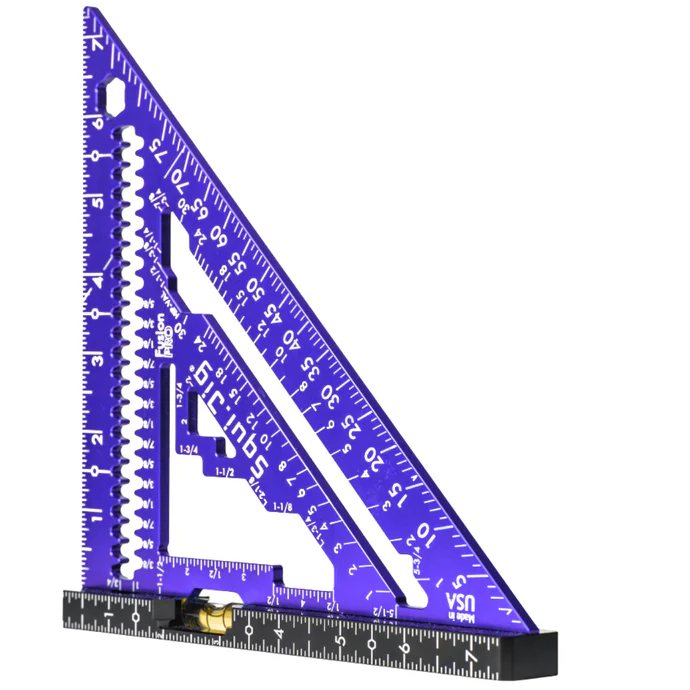 The SquiJig Fusion pro features an Ultra-Visible 360 vial for precise levelling, while the ruler heel helps trim time for efficient work. The quick mark inner design allows for fast measurements, and the crisp laser marks are easy to read for accuracy. Built-in blade wrenches in 1/2" (13mm) and 9/16" (14mm) sizes add convenience, while scribe notches are specifically designed to hold your pencil in place. Weighing only 10.3 oz, this tool is lightweight yet durable, with CNC machining that ensures superior craftsmanship. Additionally, the patented Wrench on the Heel is a unique feature exclusive to our design, further enhancing its functionality. Proudly 100% made in the USA.
