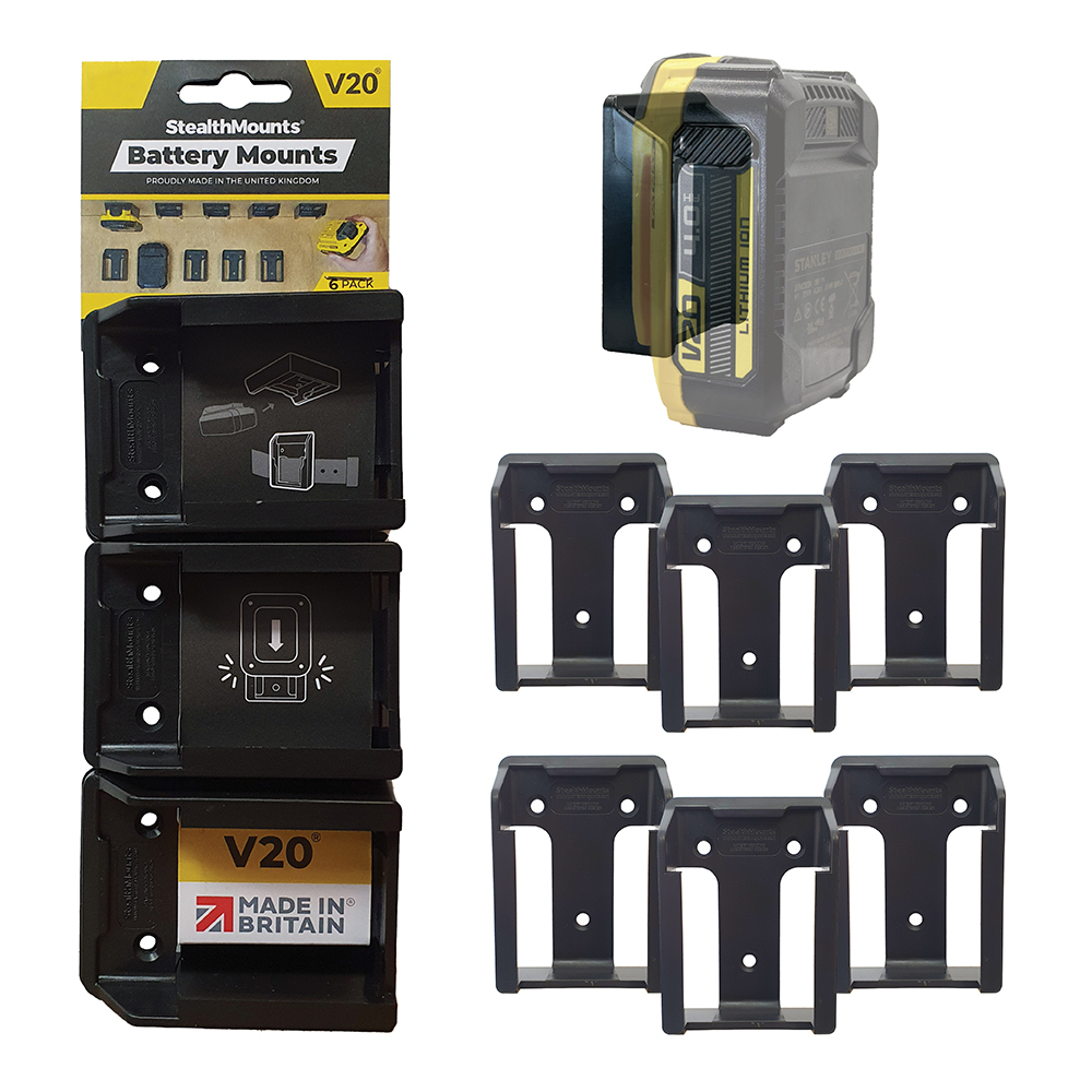 StealthMounts Battery Mounts for Stanley V20 cordless batteries keep your batteries organised and exactly where you need them. Batteries fit by clicking into the holder and are only released by pressing the release button on the battery. Batteries can be held at any angle locked in the holder and will not fall out even whilst travelling. Perfect for mobile setups or workshops! Manufactured in the United Kingdom our Stanley V20 Battery Mounts are made using extremely durable injection moulded ABS plastic with countersunk screw holes to allow for firm mounting on multiple surfaces. Great for keeping track of your batteries and staying organised. They can be mounted at any distance from one another and in tight spaces for maximum workshop efficiency. Mount them in your workshop, under shelves, toolboxes, tool trailers or in your work vehicles with due care. They can also be looped through a belt for use on the job site. StealthMounts Battery Mounts are available colour coded to match your Stanley V20 platforms.