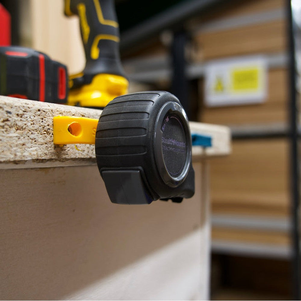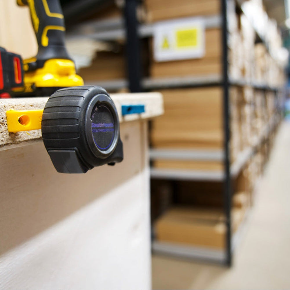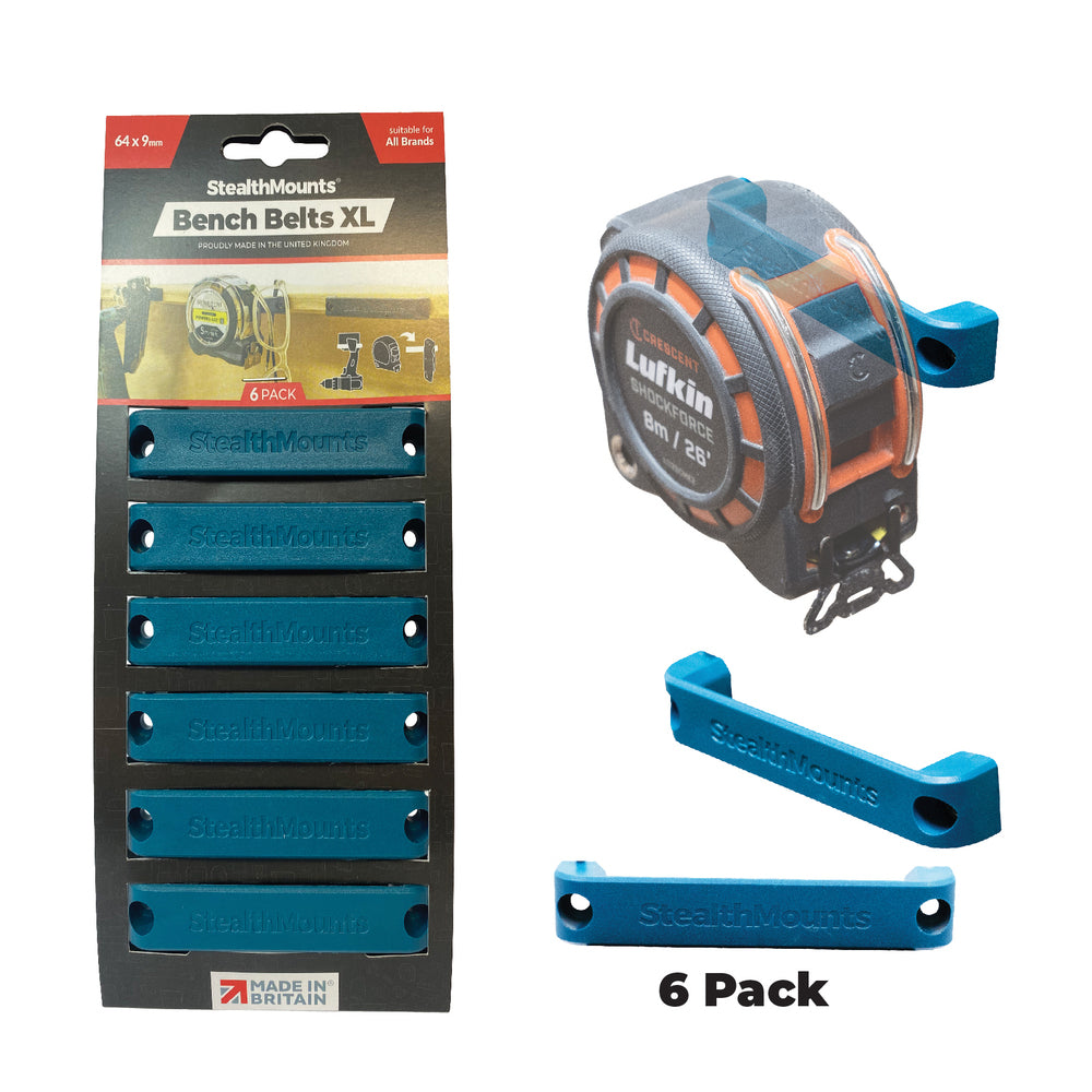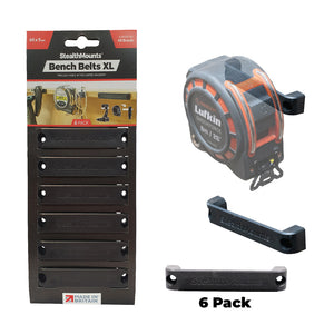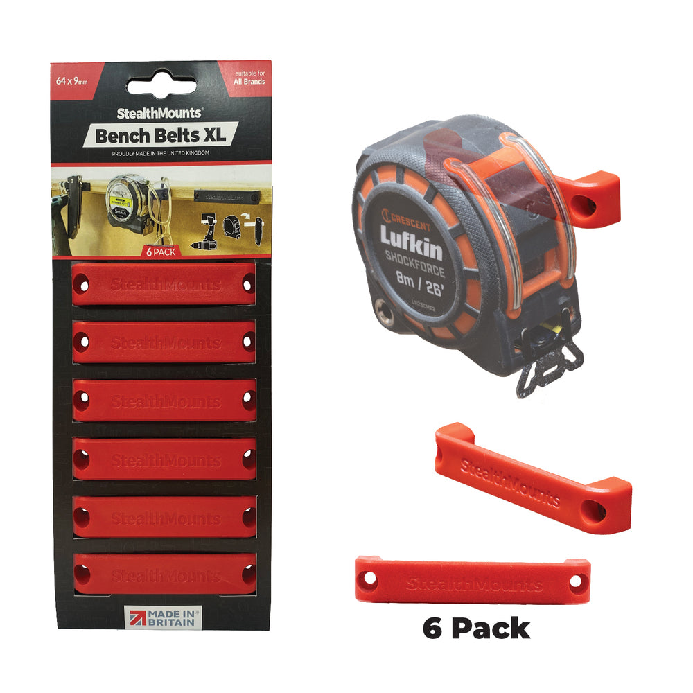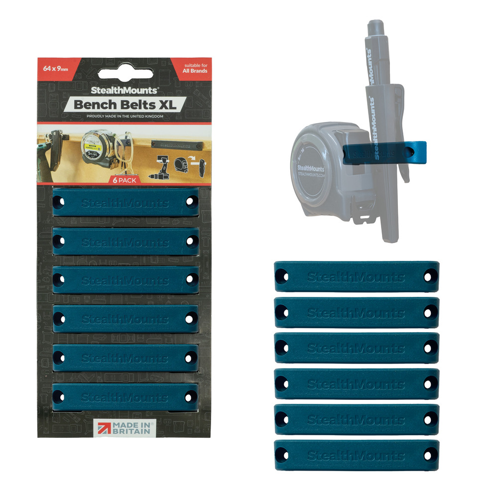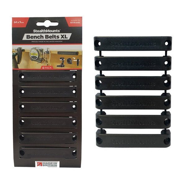 StealthMounts Bench BeltsXL are a Universal Tool Holder perfect for hanging tape measures, impact drivers, safety glasses etc. This versatile accessory keeps your most common tools easily accessible and organized. Our Bench BeltsXL can be fixed to any surface with two screws, without allowing excessive tool movement. This highly versatile accessory can be used to hang tape measures, impact drivers, safety glasses etc. Made in Great Britain our Bench BeltsXL are made with extremely durable injection moulded ABS plastic with countersunk screw holes which allow for firm mounting.