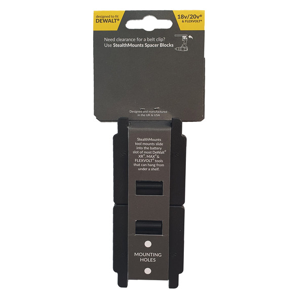StealthMounts Tool Mounts for Dewalt cordless tools keep your tools organised and right where you need them. Tools are held securely using our Snap-Fit system, simply slide your tool onto the holder until you hear a click. Made in Great Britain, our Dewalt Tool Mounts are made using extremely durable injection moulded ABS plastic with countersunk screw holes to allow for secure mounting. Ideal for keeping track of your tools and staying organised. They can be mounted at any distance from one another and in small spaces for maximum workshop efficiency. Rated for use in your workshop and under shelves. They can be used in tool trailers or in your work vehicles with due care. Easily release your tool by pulling it off the mount. Available to match your colour-coded Dewalt platform.