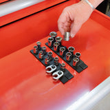 The StealthMounts Drawer Hive 3/8" Socket Holder – 10 Pack is a modular storage solution that gives professionals and DIYers complete control over their tool drawer layouts. Made in the UK from injection-molded thermoplastic elastomer (TPE), these holders feature a durable yet flexible surface that grips each 3/8" socket securely, preventing movement and rattle even in mobile setups. Each piece features graduated interlocking teeth that align precisely and allow for spacing adjustments between units. This means you can configure the layout to fit any drawer, no matter the tool size or quantity. The holders are also fully compatible with other StealthMounts Drawer Hive components, making them ideal for expanding and adapting as your collection grows.