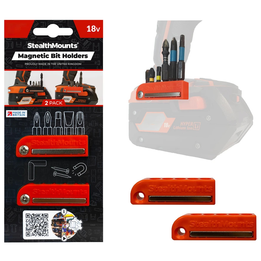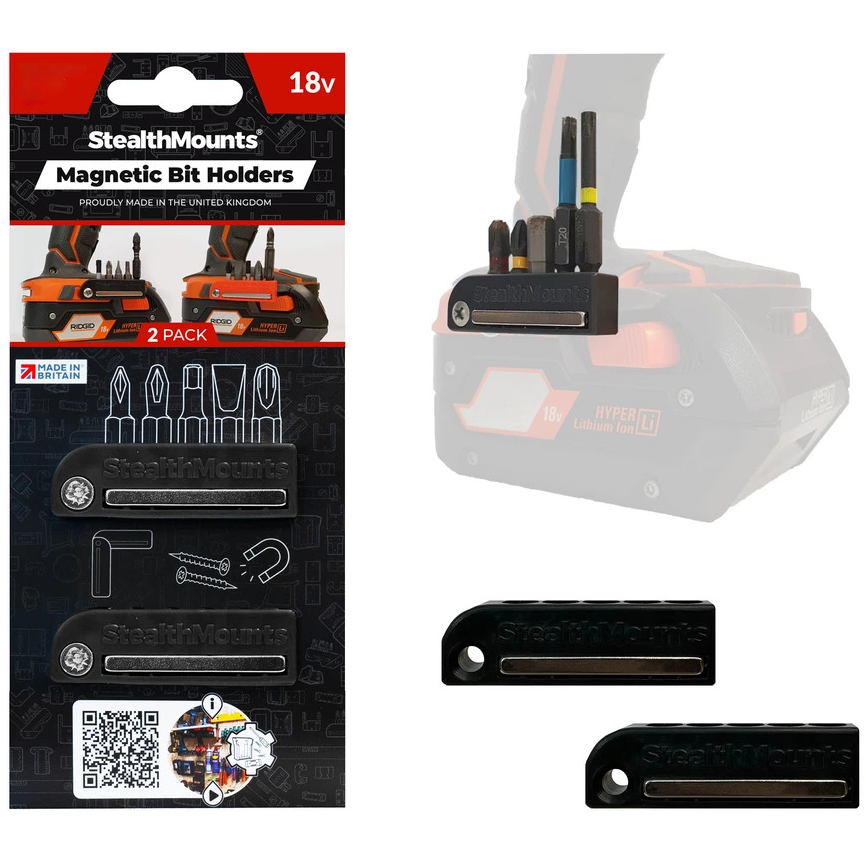 StealthMounts Bit Holders for AEG & Ridgid 18v are the perfect addition for your drill or impact driver. Each holder keeps your bits organised and mounted on your tool. Sold in a pack of 2, each magnetic bit holder can store up to 5 bits, ensuring quick access to your most used drill bits. The included screw allows mounting to most AEG & Ridgid 18v tools, and the magnetic base permits different mounting angles. Extra screws can also be stored on the side of the magnet, and bits stay in place even when mounted upside down. Made in Great Britain, these holders are crafted from durable injection moulded ABS plastic.