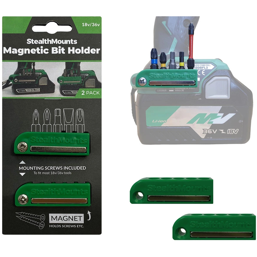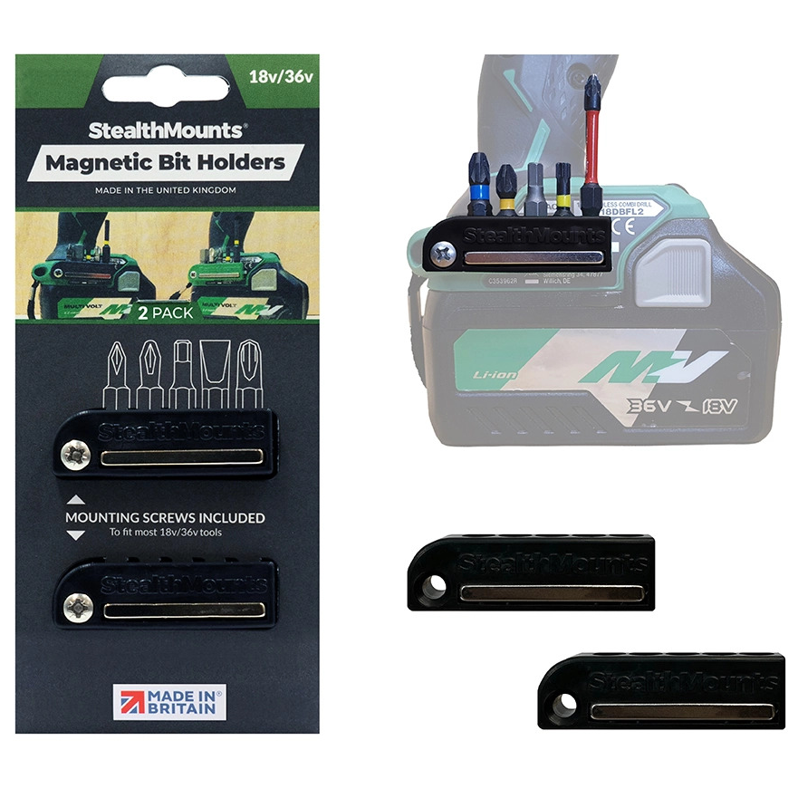 StealthMounts Bit Holders for Hikoki, MetaboHPT & Hitachi are the perfect addition for your drill or impact driver. Each holder keeps your bits organised and readily accessible on your tool. Sold in a pack of 2, each magnetic bit holder can store up to 5 bits, giving you quick access to your most used drill bits. The included screw allows mounting to most Hikoki, MetaboHPT & Hitachi tools, and the magnetic base permits different mounting angles. Extra screws can also be stored on the side of the magnet, and bits remain secure even when mounted upside down. Made in Great Britain, these holders are crafted from durable injection moulded ABS plastic.