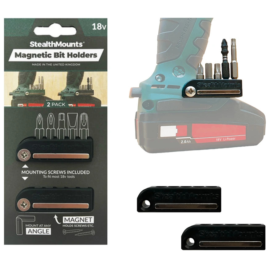 StealthMounts Bit Holders for CAS are the perfect addition for your drill or impact driver. Each holder keeps your bits organised and mounted on your tool. Sold in a pack of 2, each magnetic bit holder can store up to 5 bits, ensuring quick access to your most used drill bits. The included screw allows mounting to most CAS tools, and the magnetic base permits different mounting angles. Extra screws can also be stored on the side of the magnet, and bits stay in place even when mounted upside down. Made in Great Britain, these holders are crafted from durable injection moulded ABS plastic.