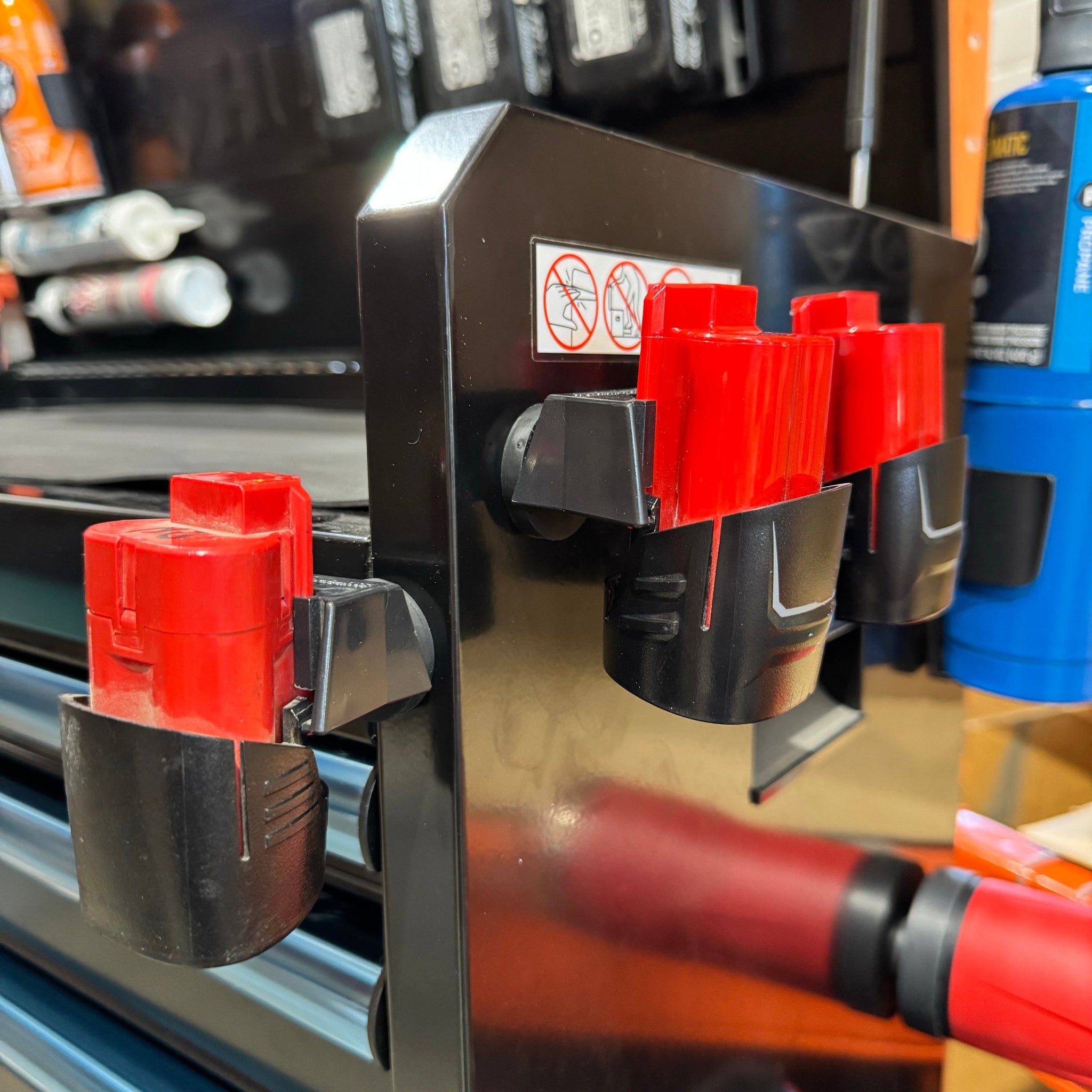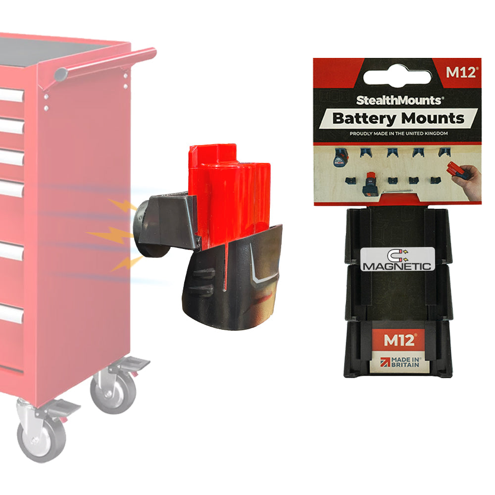 StealthMounts Magnetic Battery Mounts for Milwaukee M12 cordless batteries keep your batteries organized and exactly where you need them. Batteries click securely into place and are released only by pressing the release button on the battery. The design allows batteries to be held at any angle—locked in the holder and won’t fall out, even while travelling. Perfect for workshops, tool trailers, and mobile setups!