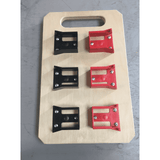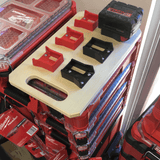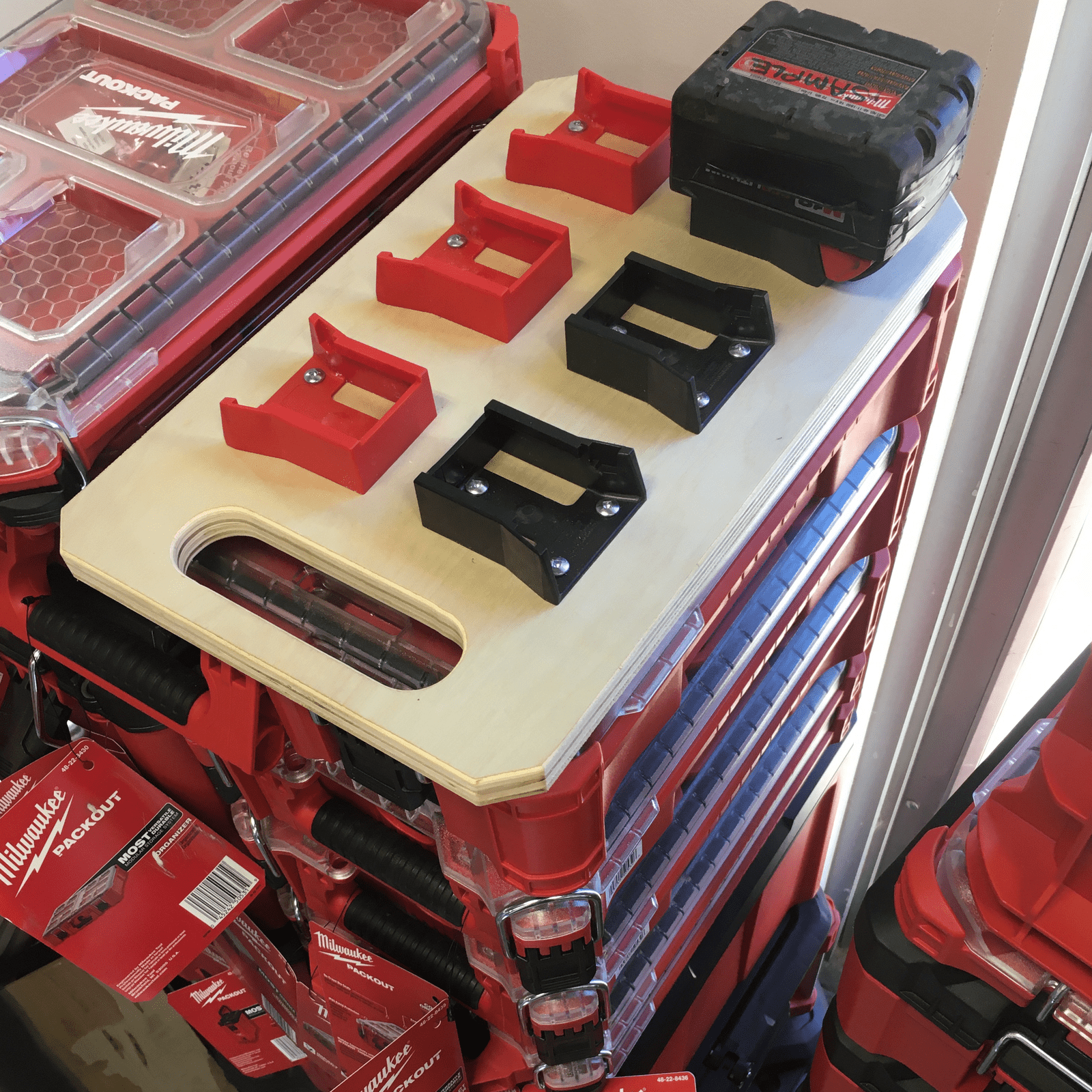 The board is equipped with 6 battery mounts to allow the user to carry up to 6 batteries at a time. The Packout Board's battery mounts are colour coded so that if the user chooses they can have their "dead batteries" mounted onto one colour, and their "charged batteries" on the other.